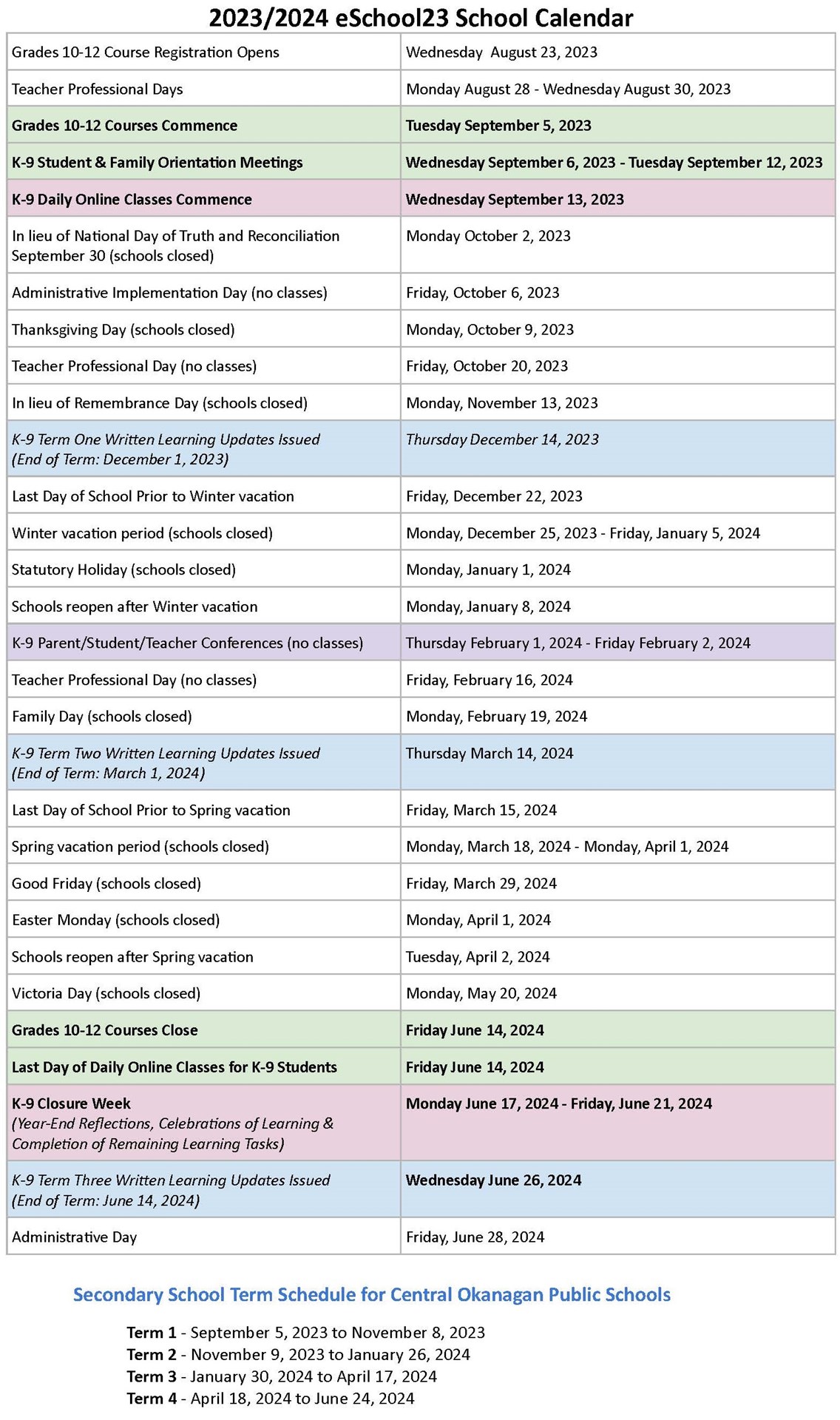 eSchool23 follows the local school calendar established by Central Okanagan Public Schools, with classes beginning in September and closing by the end of June