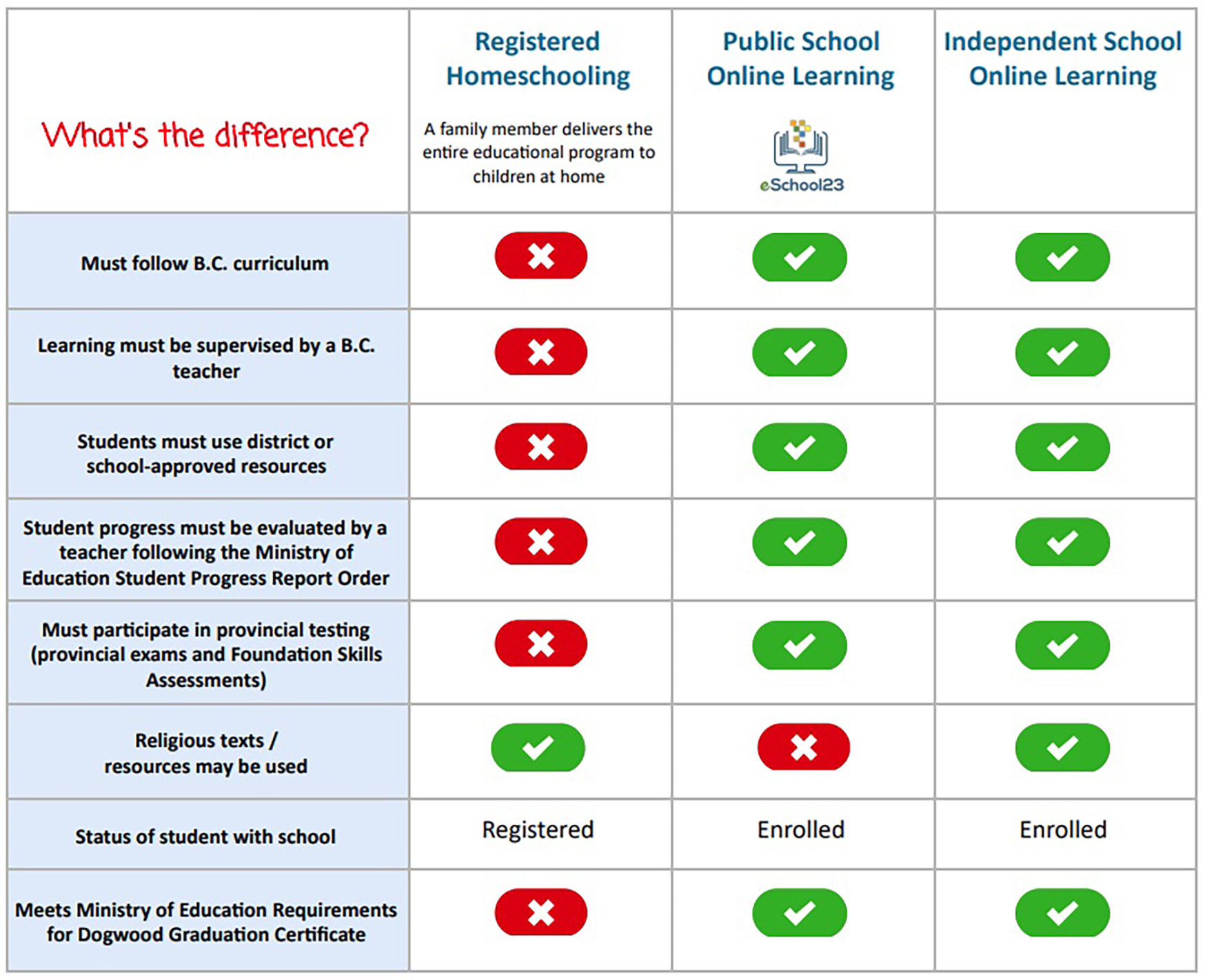 Families seeking an alternative to traditional schools may choose to enroll with eSchool23 or another online learning program in the province. Programs are free for residents of BC. onlinelearningbc.com is a provincial site that allows families to search for suitable programs across the province. Alternatively, parents/guardians may choose to homeschool their child(ren) in accordance with BC Ministry of Education Homeschool Policy.